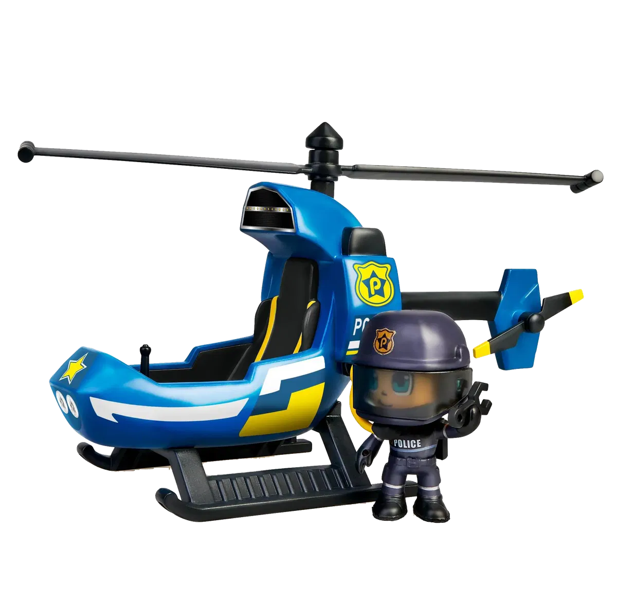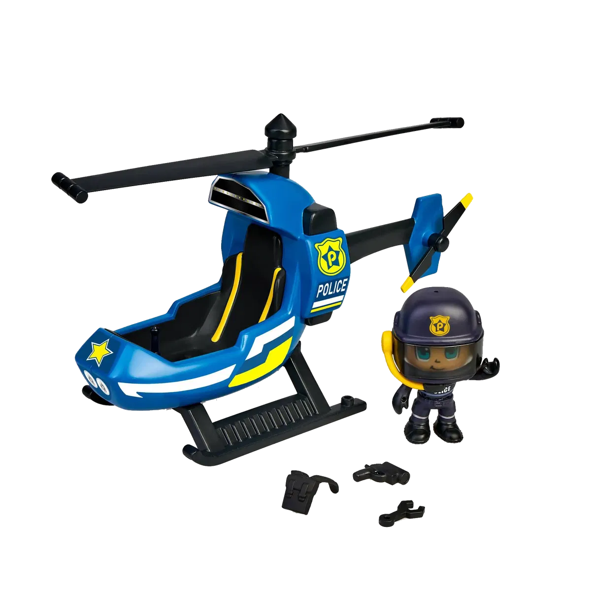 Pinypon Action | Juguete Helicóptero de Policía “Patrulla y protege la cuidad”. Puede aterrizar en cualquier sitio, incluyendo en el tejado de la Comisaría. El vehículo es mono plaza y giran las hélices. Incluye figura policía y accesorios. Divertíte protegiendo la ciudad.