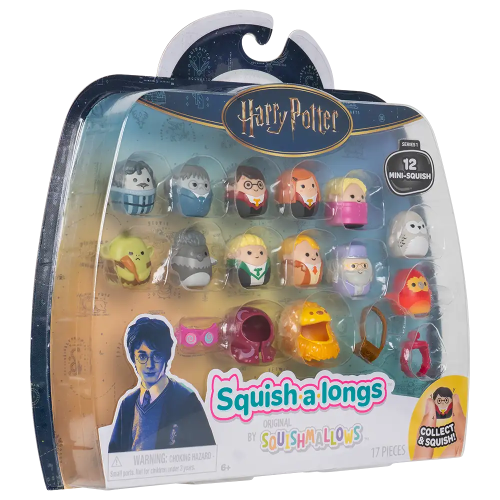 SquishAlongs Harry Potter 12 Figure Pack convierte a los Squishmallows en mini figuras coleccionables de una manera totalmente nueva. Este set incluye 12 personajes de 1 pulgada, fabricados en plástico blando y suave al tacto, perfectos para apretar, coleccionar y sumar al universo mágico de Hogwarts.