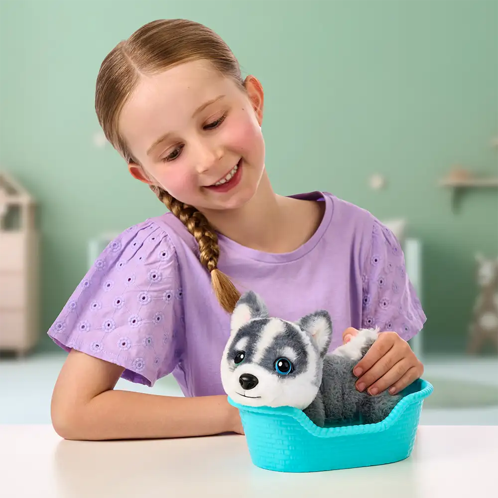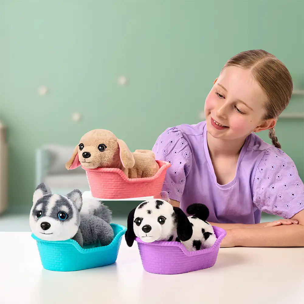 El surtido incluye tres personajes adorables: Buddy el labrador, Pepper la dálmata y Aurora la husky, cada uno con su propia personalidad. Cada cachorro viene acompañado de una cucha en forma de canasta, perfecta para guardarlos o usarlos como escenario de juego.