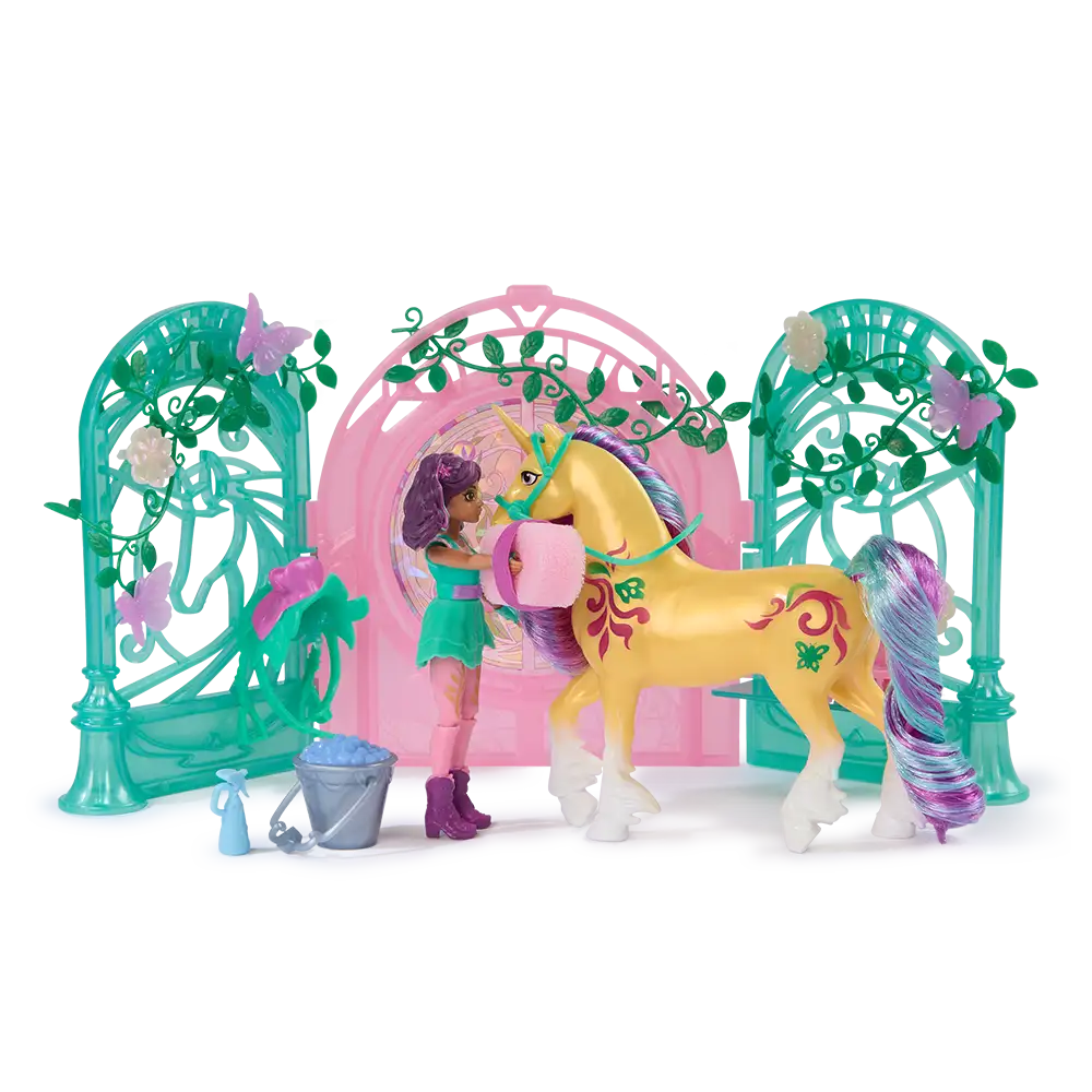 El juego se completa con 15 accesorios temáticos, entre ellos: una botella de spray que Ava puede sostener, una esponja, cubo de bayas para alimentar a Leaf, un cepillo para su melena sedosa y decoración para el puesto con mariposas, flores y enredaderas. Además, sillín y brida extraíbles agregan realismo al juego de simulación.