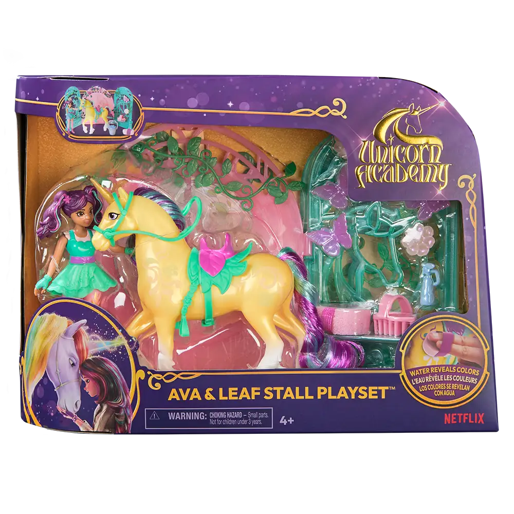 El juego de Unicornio y Muñeca Ava + Leaf incluye una muñeca Ava de 11,43 cm (4,5 pulgadas) y su unicornio Leaf de 12,7 cm (5 pulgadas). El unicornio cuenta con un efecto mágico de cambio de color: al sumergir la esponja en agua fría y aplicarla sobre su cuerpo, se revelan mágicamente marcas de Plant Magic, recreando la escena en la que Leaf obtiene sus poderes.