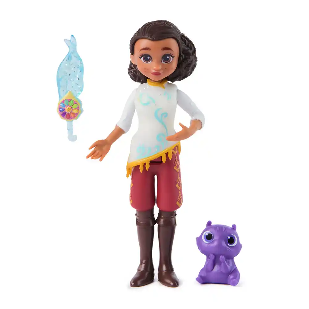 Hechizados ¡La princesa Elian con su fiel mascota Flink y accesorios para recrear su increíble aventura! Inspirada en la nueva serie de Netflix, esta muñeca te invita a vivir la épica historia de Elian, quien deberá salvar el reino de Lumbria y a sus padres, convertidos en monstruos por una misteriosa maldición. La oscuridad se ha apoderado del reino y los ministros Bolinar y Nazara culpan a los monstruos (el rey y la reina) de la maldición, con intenciones de destruirlos. ¡Ayudá a Elian a romper la maldición y restaurar la paz en Lumbria! Elian muñeca con mascota Flink y accesorio de cartera .Muñeca articulada de Elian con un pequeño cachorro y accesorio. 9cm
