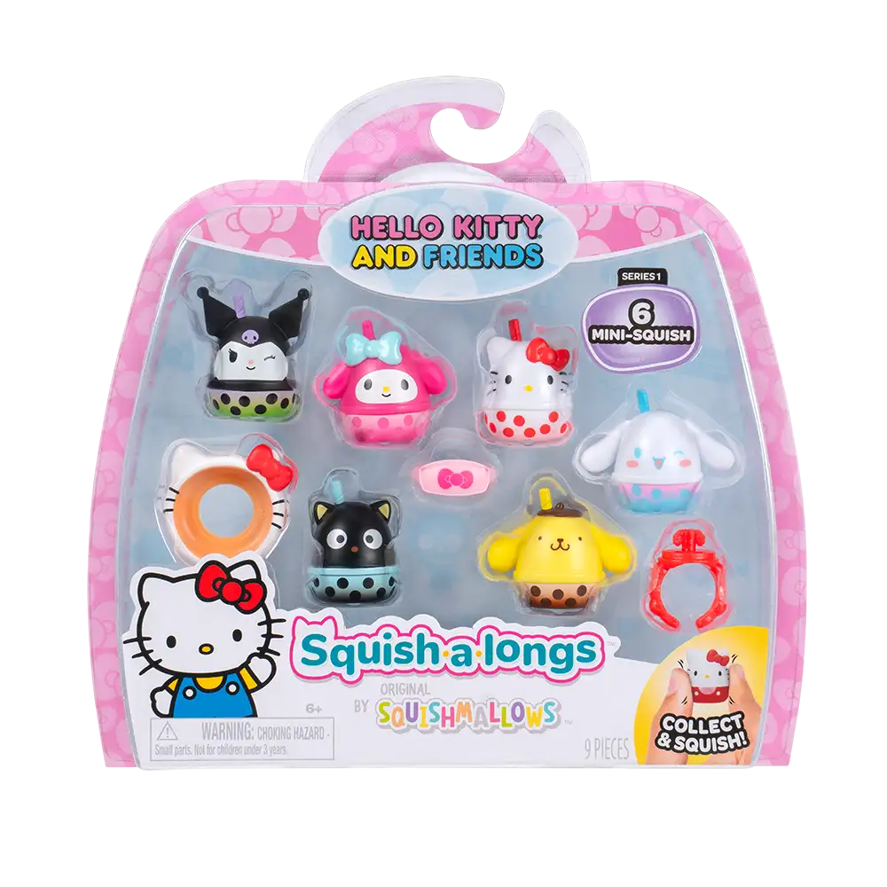 Este set incluye a los personajes más icónicos de Hello Kitty y sus amigos, reinterpretados en versión SquishAlongs, ofreciendo una experiencia diferente y adorable. Su tamaño compacto los hace fáciles de transportar, mientras que su diseño detallado atrae tanto a niños como a coleccionistas.