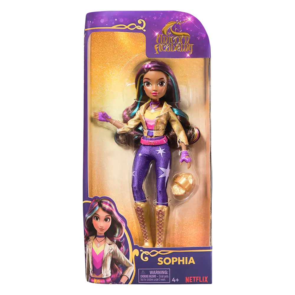 Unicorn Academy | Academia Unicornio Sophia muñeca articulada Pelo ondulado y chaqueta, camisa, pantalon, cinturón, zapatos, guantes y cepillo para pelo. ¿Qué pasa si estás destinado a algo más… algo extraordinario? Una serie animada y una franquicia de aventuras original de Netflix, producida por Spin Master Entertainment, transportará al público a un mundo mágico mientras siguen a Sophia en su viaje de lo ordinario a lo extraordinario, mientras descubre su destino como jinete de unicornio. Unicorn Academy es el internado de los sueños de todo niño. Ubicada en la Isla Unicornio, Sophia y el resto de la clase de primer año deben unirse con sus unicornios para desbloquear sus poderes mágicos. Sólo entonces estos estudiantes aprenderán a convertirse en venerados protectores de la isla y su magia, todo mientras equilibran el trabajo de clase, navegan por amistades y rivalidades y enfrentan las pruebas y tribulaciones de la típica vida adolescente.