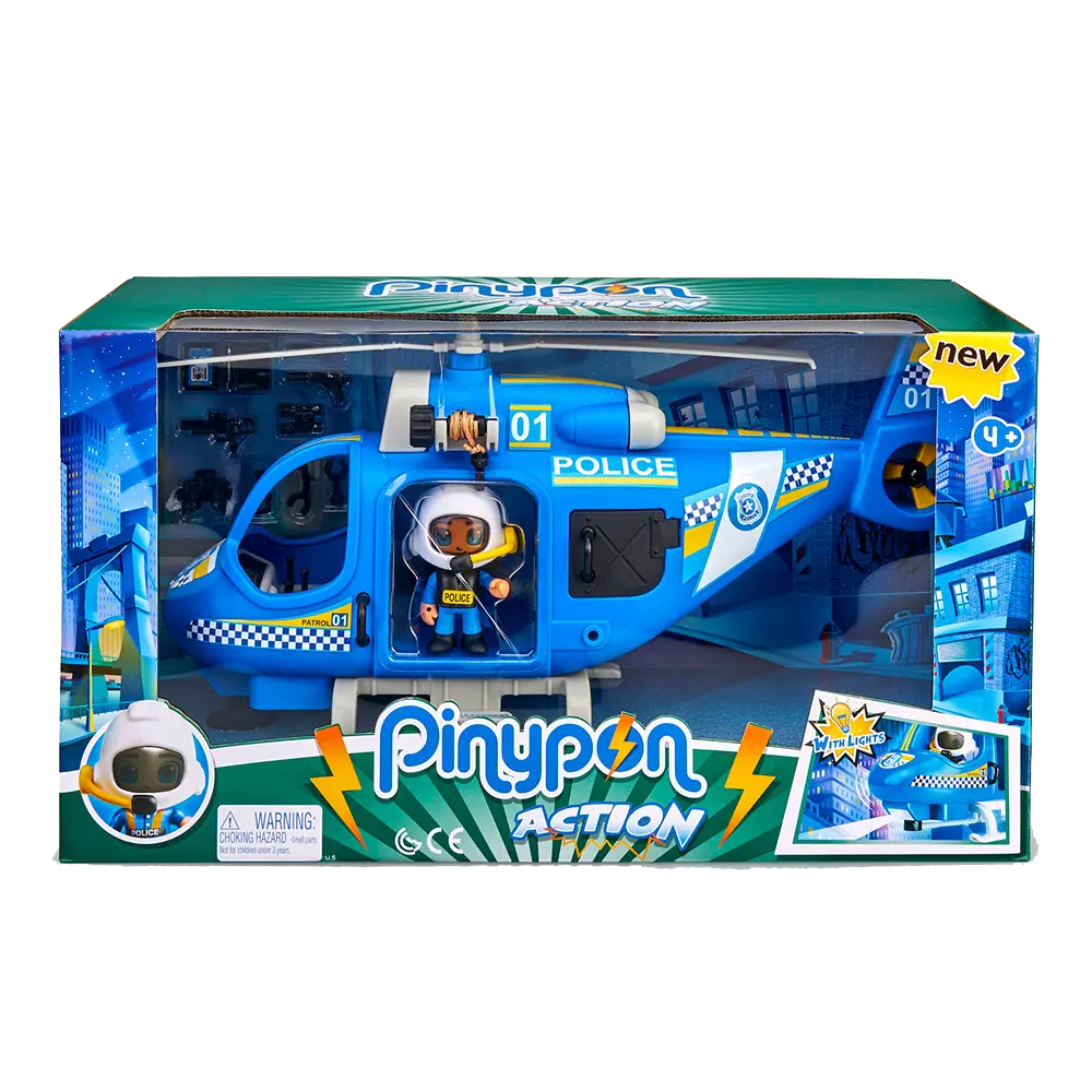 Pinypon Action | Juguete Helicóptero de policía con luz para poder guiarse en misiones nocturnas y hélices giratorias. Cuenta con compartimento para guardar accesorios incluidos: pistola, chaleco antibalas, esposas y ¡mucho más! Tiene sistema de polea para acercar/alejar elementos. Incluye figura policía con casco.